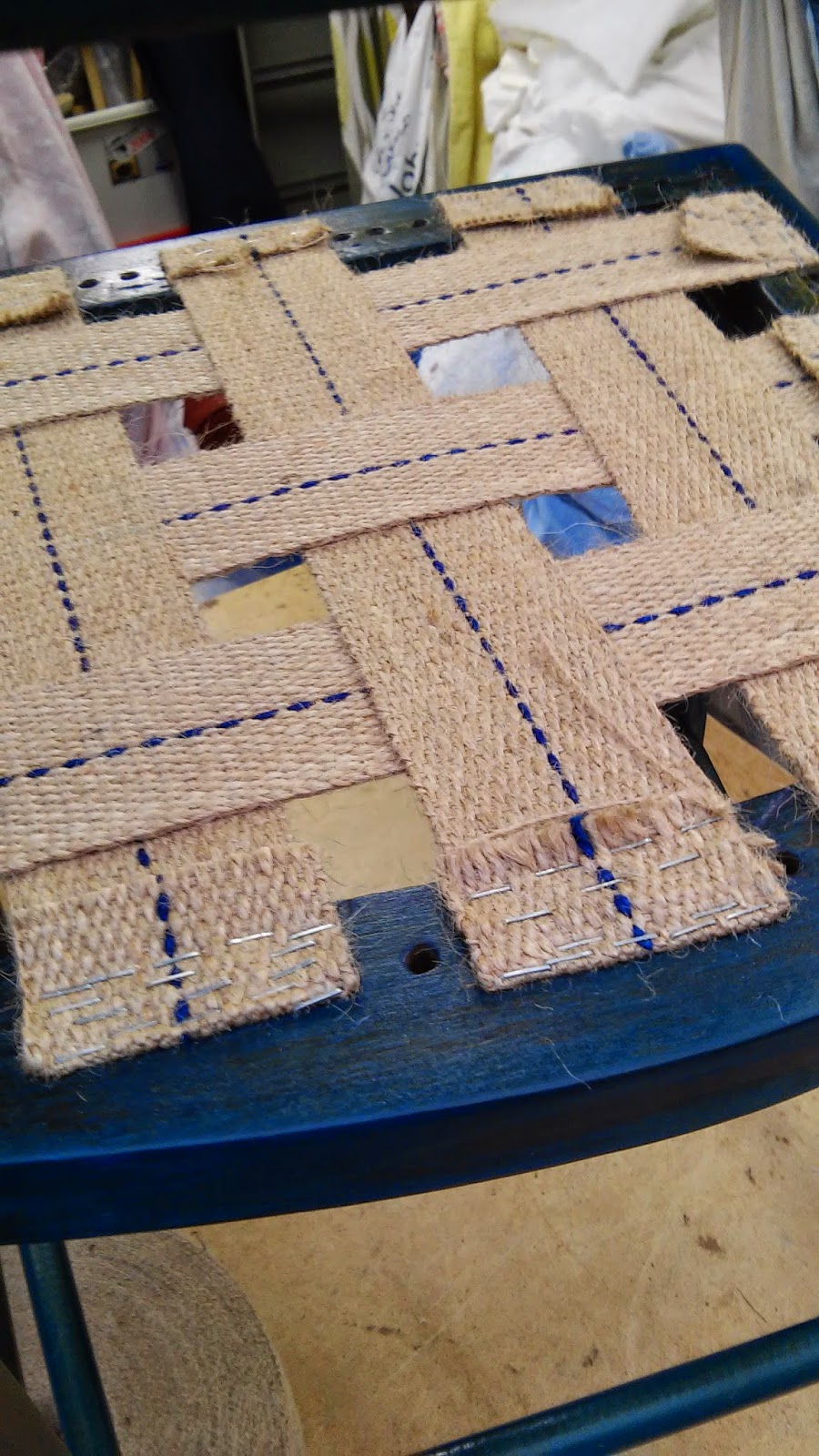A few photos showing one of our re worked chairs in progress. I did the stripping and refinishing and Barbara did the seat. The chair originally had a cane seat, but it takes so long to re-cane that we decided on a pin-stuffed seat reusing an old denim jacket of mine - a favourite one at that!