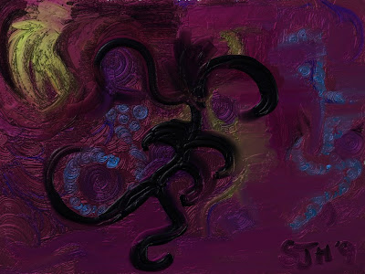 My partner Barbara has given me a 'Bamboo Fun' graphics tablet for Christmas - a big treat! I've been playing with it and this is my first 'painting' with it. It looks so like real paint! I couldn't resist having a metallic sheen to it all. A bit tacky really..... The software I'm using, that came as part of the package is called ArtRage2. It's pretty easy to use and I'm looking forward to exploring all the possibilities.